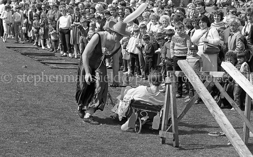 Barrhead Gala Day in 1984 started off a bit wet but soon the sun shone and all the annual events including the Craigie Race, Bonny Baby Competition and Pipe Band Competition went ahead as usual. The event took place in the town's Cowan Park after the Float Procession and parade made their way from the station and through the main sreets of the town. As always the events were watched over by that years Gala Quen and her maids. Pictures by Stephen Mansfield.