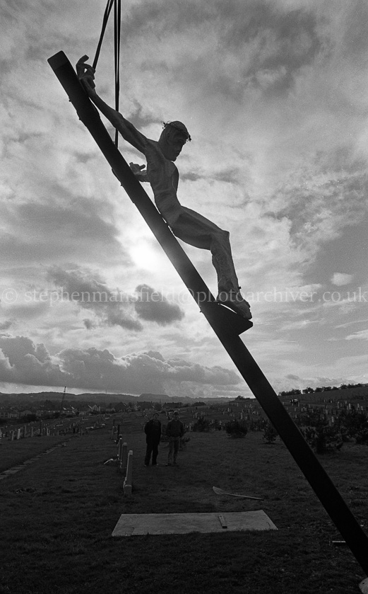 A statue of Christ by Paisley sculptor John Sutherland is gently raised into place at it's permanent site at St. Conval's graveyard in Barrhead on the 16th October 1986. Picture by Stephen Mansfield.