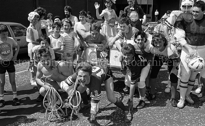 In June 1986 two rival American Football teams, the Barrhead Redhawks and the Johnstone Crusaders challenged each other to a race to the top of Barrhead's historic Craige each carrying a hospital bed and to raise funds for the Accord Hospice in Paisley. Picture by Stephen Mansfield