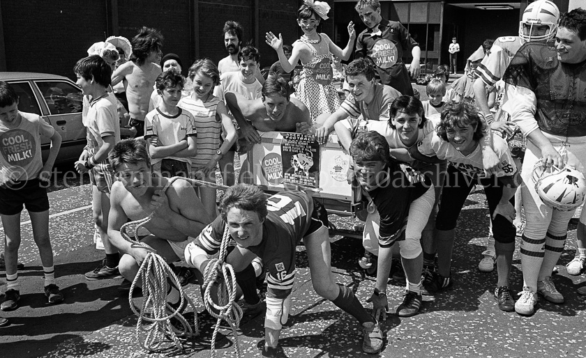In June 1986 two rival American Football teams, the Barrhead Redhawks and the Johnstone Crusaders challenged each other to a race to the top of Barrhead's historic Craige each carrying a hospital bed and to raise funds for the Accord Hospice in Paisley. Picture by Stephen Mansfield