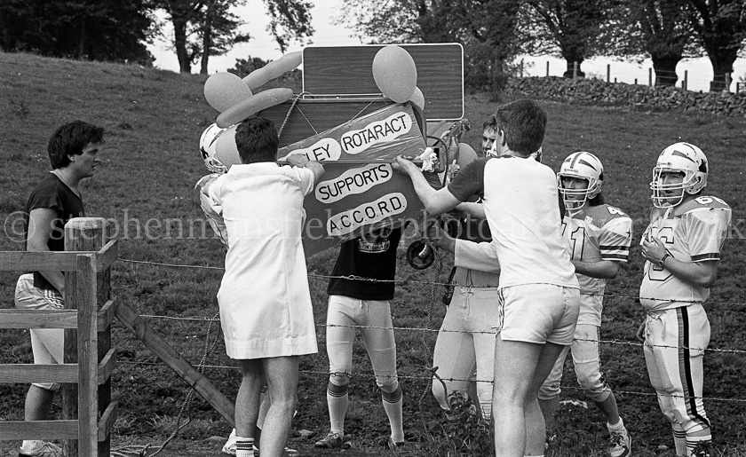 In June 1986 two rival American Football teams, the Barrhead Redhawks and the Johnstone Crusaders challenged each other to a race to the top of Barrhead's historic Craige each carrying a hospital bed and to raise funds for the Accord Hospice in Paisley. Picture by Stephen Mansfield