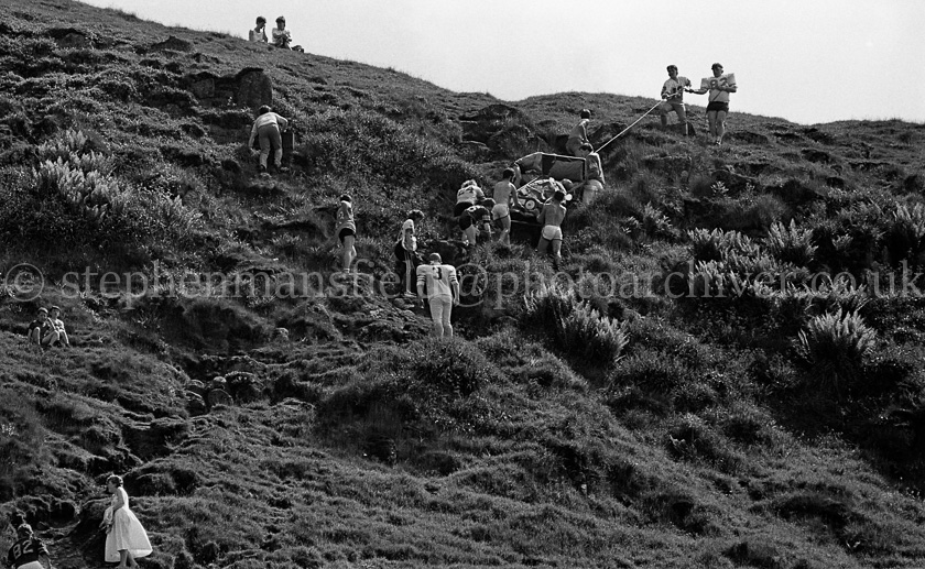 In June 1986 two rival American Football teams, the Barrhead Redhawks and the Johnstone Crusaders challenged each other to a race to the top of Barrhead's historic Craige each carrying a hospital bed and to raise funds for the Accord Hospice in Paisley. Picture by Stephen Mansfield
