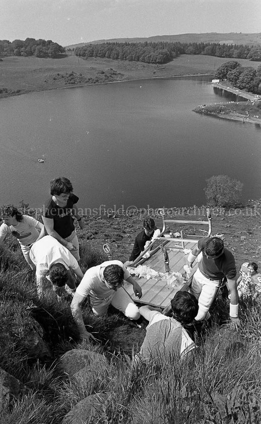 In June 1986 two rival American Football teams, the Barrhead Redhawks and the Johnstone Crusaders challenged each other to a race to the top of Barrhead's historic Craige each carrying a hospital bed and to raise funds for the Accord Hospice in Paisley. Picture by Stephen Mansfield