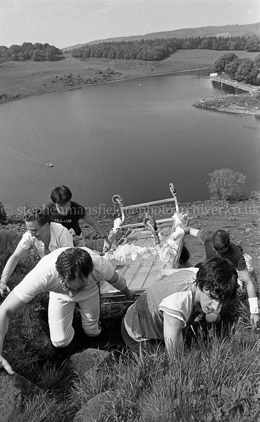 In June 1986 two rival American Football teams, the Barrhead Redhawks and the Johnstone Crusaders challenged each other to a race to the top of Barrhead's historic Craige each carrying a hospital bed and to raise funds for the Accord Hospice in Paisley. Picture by Stephen Mansfield