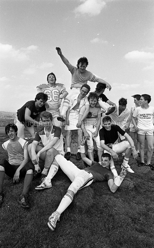 In June 1986 two rival American Football teams, the Barrhead Redhawks and the Johnstone Crusaders challenged each other to a race to the top of Barrhead's historic Craige each carrying a hospital bed and to raise funds for the Accord Hospice in Paisley. Picture by Stephen Mansfield