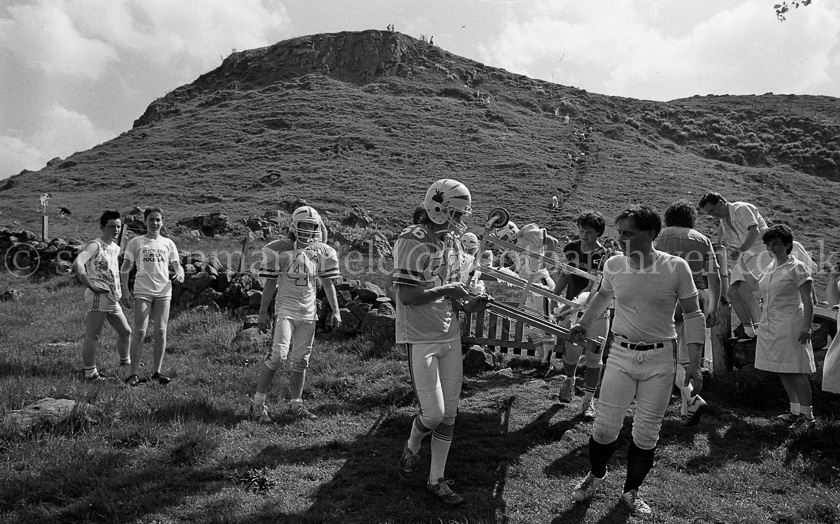 In June 1986 two rival American Football teams, the Barrhead Redhawks and the Johnstone Crusaders challenged each other to a race to the top of Barrhead's historic Craige each carrying a hospital bed and to raise funds for the Accord Hospice in Paisley. Picture by Stephen Mansfield