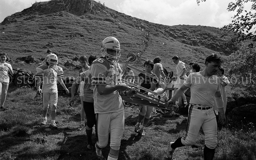 In June 1986 two rival American Football teams, the Barrhead Redhawks and the Johnstone Crusaders challenged each other to a race to the top of Barrhead's historic Craige each carrying a hospital bed and to raise funds for the Accord Hospice in Paisley. Picture by Stephen Mansfield