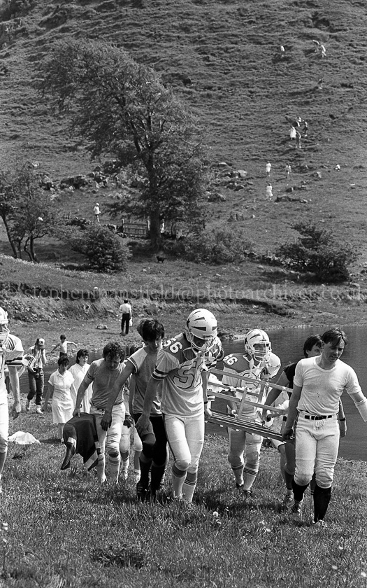 In June 1986 two rival American Football teams, the Barrhead Redhawks and the Johnstone Crusaders challenged each other to a race to the top of Barrhead's historic Craige each carrying a hospital bed and to raise funds for the Accord Hospice in Paisley. Picture by Stephen Mansfield