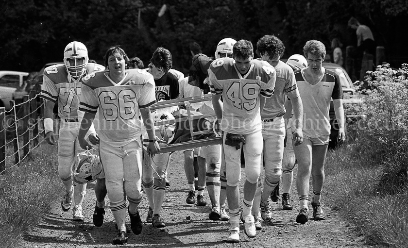 In June 1986 two rival American Football teams, the Barrhead Redhawks and the Johnstone Crusaders challenged each other to a race to the top of Barrhead's historic Craige each carrying a hospital bed and to raise funds for the Accord Hospice in Paisley. Picture by Stephen Mansfield