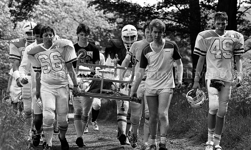 In June 1986 two rival American Football teams, the Barrhead Redhawks and the Johnstone Crusaders challenged each other to a race to the top of Barrhead's historic Craige each carrying a hospital bed and to raise funds for the Accord Hospice in Paisley. Picture by Stephen Mansfield
