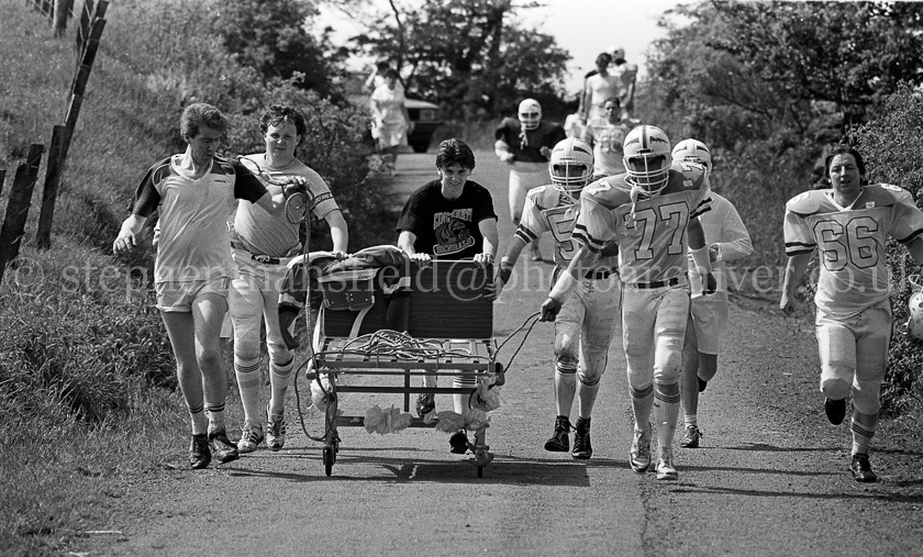 In June 1986 two rival American Football teams, the Barrhead Redhawks and the Johnstone Crusaders challenged each other to a race to the top of Barrhead's historic Craige each carrying a hospital bed and to raise funds for the Accord Hospice in Paisley. Picture by Stephen Mansfield