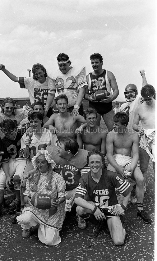 In June 1986 two rival American Football teams, the Barrhead Redhawks and the Johnstone Crusaders challenged each other to a race to the top of Barrhead's historic Craige each carrying a hospital bed and to raise funds for the Accord Hospice in Paisley. Picture by Stephen Mansfield