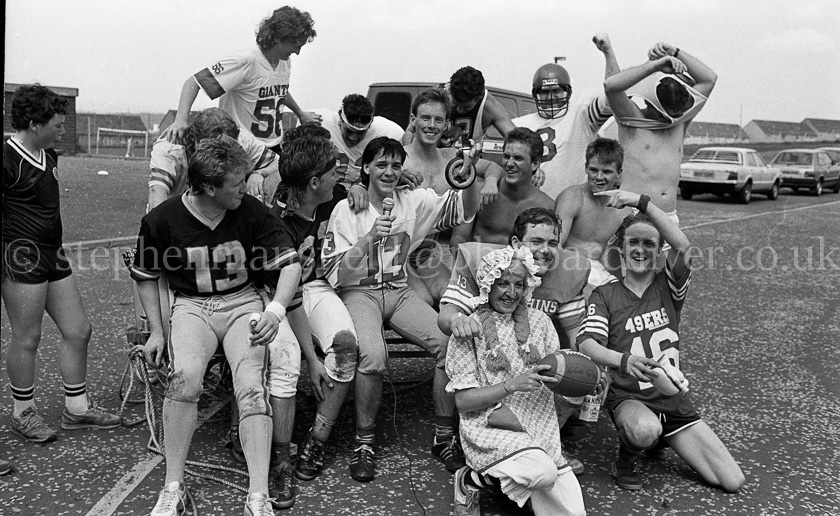 In June 1986 two rival American Football teams, the Barrhead Redhawks and the Johnstone Crusaders challenged each other to a race to the top of Barrhead's historic Craige each carrying a hospital bed and to raise funds for the Accord Hospice in Paisley. Picture by Stephen Mansfield