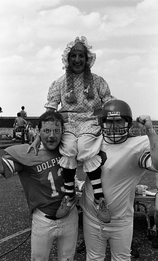 In June 1986 two rival American Football teams, the Barrhead Redhawks and the Johnstone Crusaders challenged each other to a race to the top of Barrhead's historic Craige each carrying a hospital bed and to raise funds for the Accord Hospice in Paisley. Picture by Stephen Mansfield
