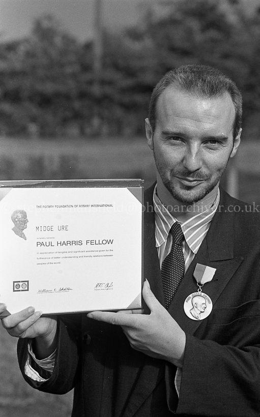 The Scottish rock star Midge Ure was presented with a Paul Harris Fellowship for his Humanitarian work by the Barrhead Rotary Club at the Scout Association Outdoor Activity Centre in Uddingston on the 17th August 1986. Picture by Stephen Mansfield.