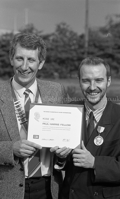 The Scottish rock star Midge Ure was presented with a Paul Harris Fellowship for his Humanitarian work by the Barrhead Rotary Club at the Scout Association Outdoor Activity Centre in Uddingston on the 17th August 1986. Picture by Stephen Mansfield.