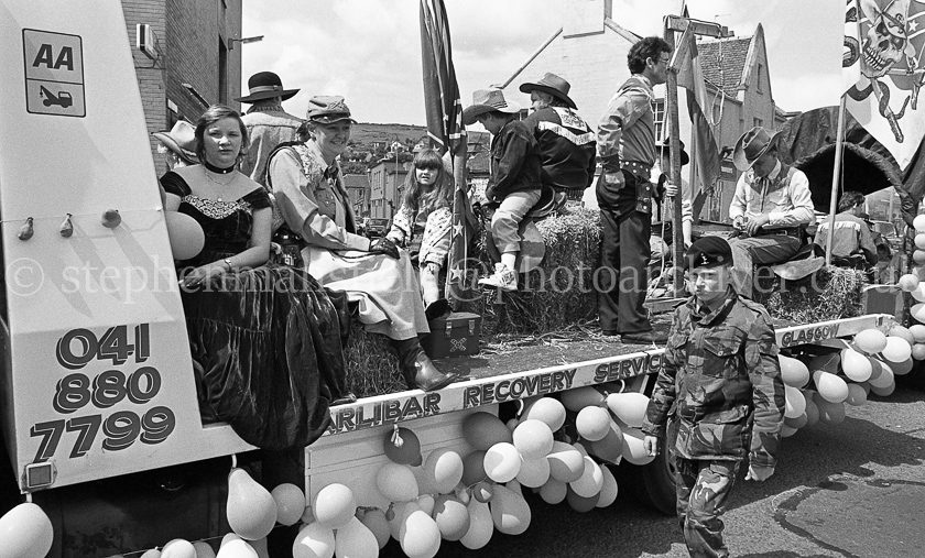 Barrhead Gala Day on Saturday 4th June 1988 was one of the most successful helped mainly by the great weather and the combination of the World Pipe Band Championships.It began as usual with the float procession up Cross Arthurlie Street and along the Main Street led by the Neilston & District Pipe Band and to Cowan Park. Pictures by Stephen Mansfield.