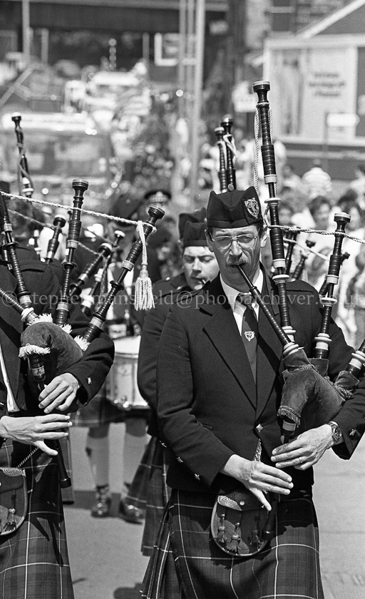 Barrhead Gala Day on Saturday 4th June 1988 was one of the most successful helped mainly by the great weather and the combination of the World Pipe Band Championships.It began as usual with the float procession up Cross Arthurlie Street and along the Main Street led by the Neilston & District Pipe Band and to Cowan Park. Pictures by Stephen Mansfield.