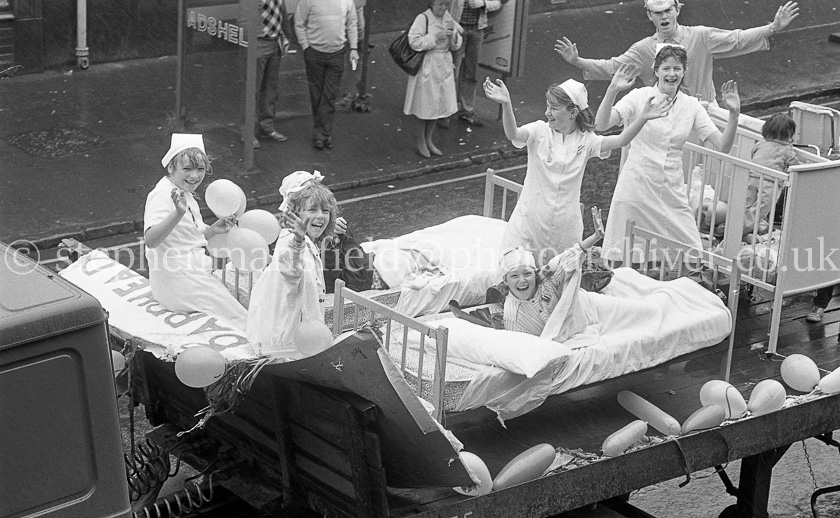 Barrhead Gala Day on Saturday 6th June1987 was one of the wettest in it's history however the show went ahead with the usual float parade led by the Neilston and District Pipe Band and majorettes from the local dancing schools. In the Cowan Park events included the iconic pub pram race, the Gala Queen crowning, bonny baby and pipe band competition. Even the bowlers managed to play a few ends in between the showers. Pictures by Stephen Mansfield