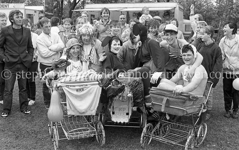 Barrhead Gala Day on Saturday 6th June1987 was one of the wettest in it's history however the show went ahead with the usual float parade led by the Neilston and District Pipe Band and majorettes from the local dancing schools. In the Cowan Park events included the iconic pub pram race, the Gala Queen crowning, bonny baby and pipe band competition. Even the bowlers managed to play a few ends in between the showers. Pictures by Stephen Mansfield
