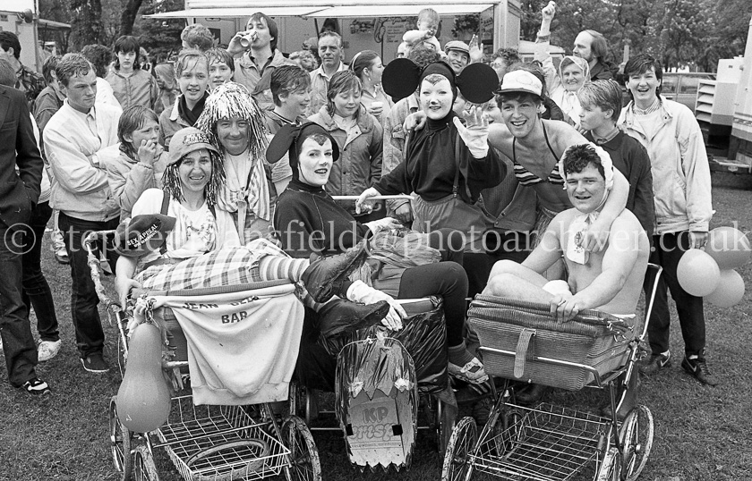 Barrhead Gala Day on Saturday 6th June1987 was one of the wettest in it's history however the show went ahead with the usual float parade led by the Neilston and District Pipe Band and majorettes from the local dancing schools. In the Cowan Park events included the iconic pub pram race, the Gala Queen crowning, bonny baby and pipe band competition. Even the bowlers managed to play a few ends in between the showers. Pictures by Stephen Mansfield