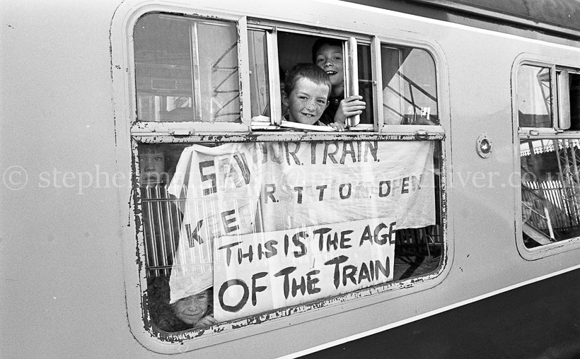 A large crowd of early morning travellers gathered at Neilston Train Station in April 1984 to protest about possible closure of the line. Picture by Stephen Mansfield.