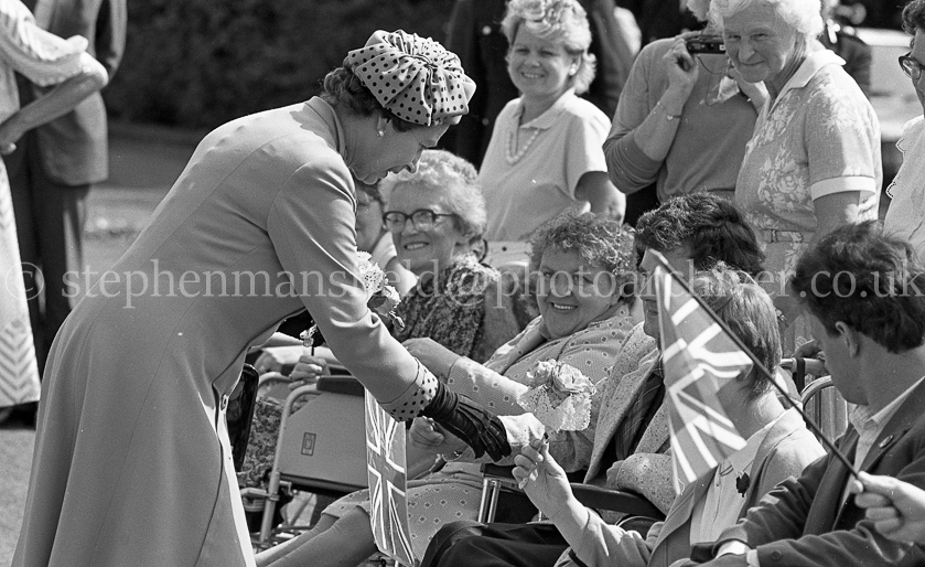 H.M. Queen Elizabeth II visited St. Margaret of Scotland Hospice, Clydebank on the 9th August 1986 where she met the patients and hard working staff and was cheered on by many onlookers. The pictures were taken by Stephen Mansfield for the Clydebank Post.