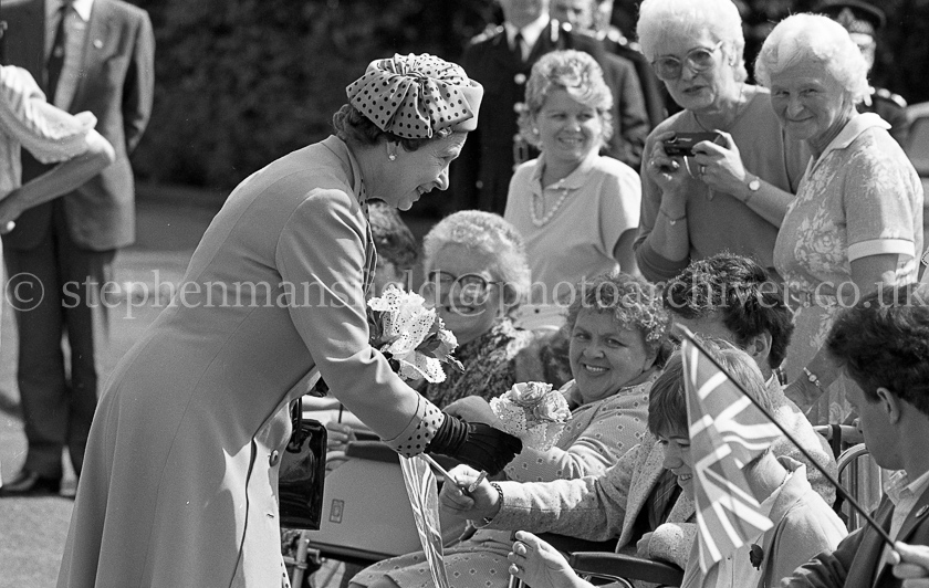 H.M. Queen Elizabeth II visited St. Margaret of Scotland Hospice, Clydebank on the 9th August 1986 where she met the patients and hard working staff and was cheered on by many onlookers. The pictures were taken by Stephen Mansfield for the Clydebank Post.