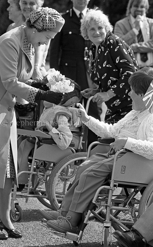 H.M. Queen Elizabeth II visited St. Margaret of Scotland Hospice, Clydebank on the 9th August 1986 where she met the patients and hard working staff and was cheered on by many onlookers. The pictures were taken by Stephen Mansfield for the Clydebank Post.