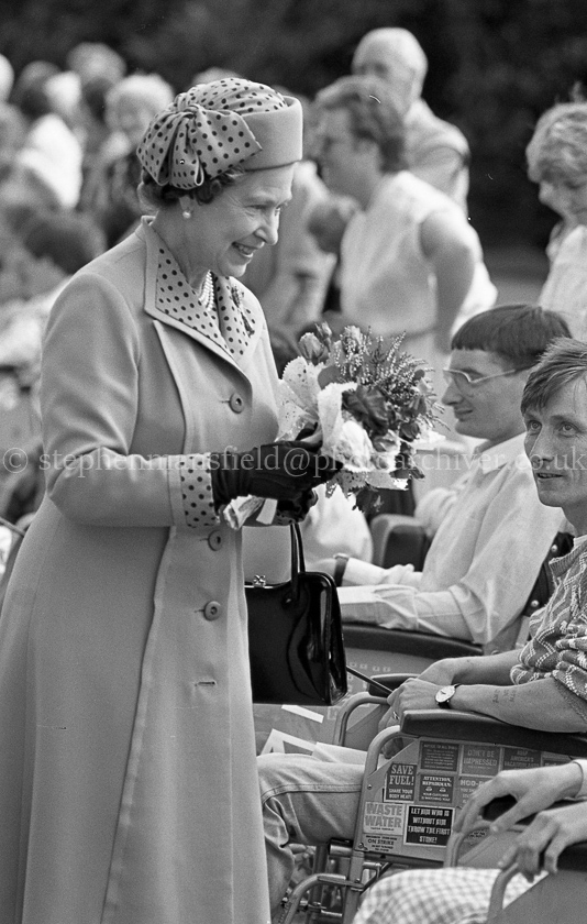 H.M. Queen Elizabeth II visited St. Margaret of Scotland Hospice, Clydebank on the 9th August 1986 where she met the patients and hard working staff and was cheered on by many onlookers. The pictures were taken by Stephen Mansfield for the Clydebank Post.