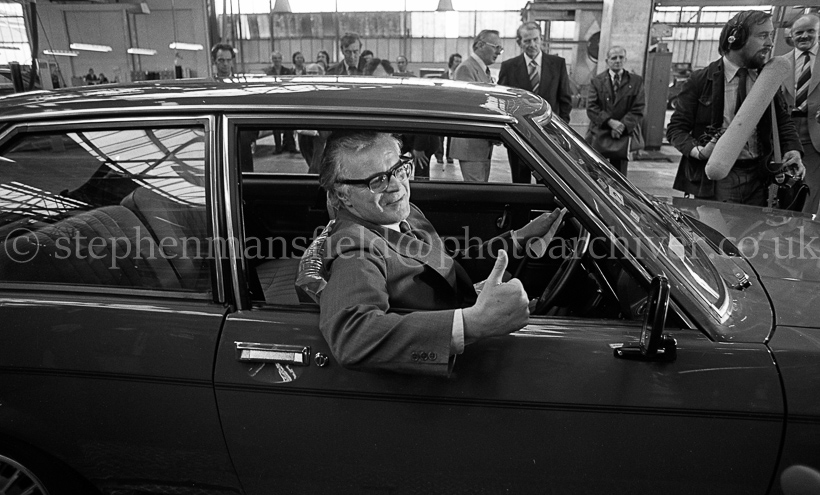 Scottish Secretary of State Bruce Millan visited the Rootes Chrysler Car Factory in Linwood in 1977 and viewed the latest model of the Sunbeam come off the assembly line.