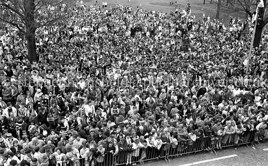 The St. Mirren Football team arrive back in Paisley after winning the Scottish Cup in the 1-0 final with Dundee United at Hampden Park. Ian Ferguson was the scorer and was the third cup win in their then 110-year history. Pictures by Stephen Mansfield.