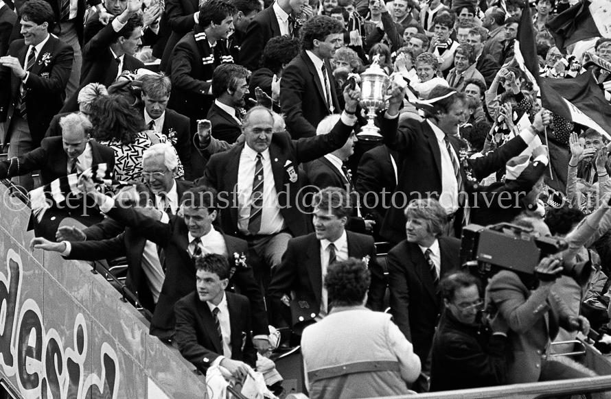 The St. Mirren Football team arrive back in Paisley after winning the Scottish Cup in the 1-0 final with Dundee United at Hampden Park. Ian Ferguson was the scorer and was the third cup win in their then 110-year history. Pictures by Stephen Mansfield.