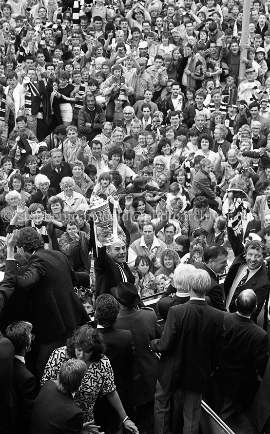 The St. Mirren Football team arrive back in Paisley after winning the Scottish Cup in the 1-0 final with Dundee United at Hampden Park. Ian Ferguson was the scorer and was the third cup win in their then 110-year history. Pictures by Stephen Mansfield.