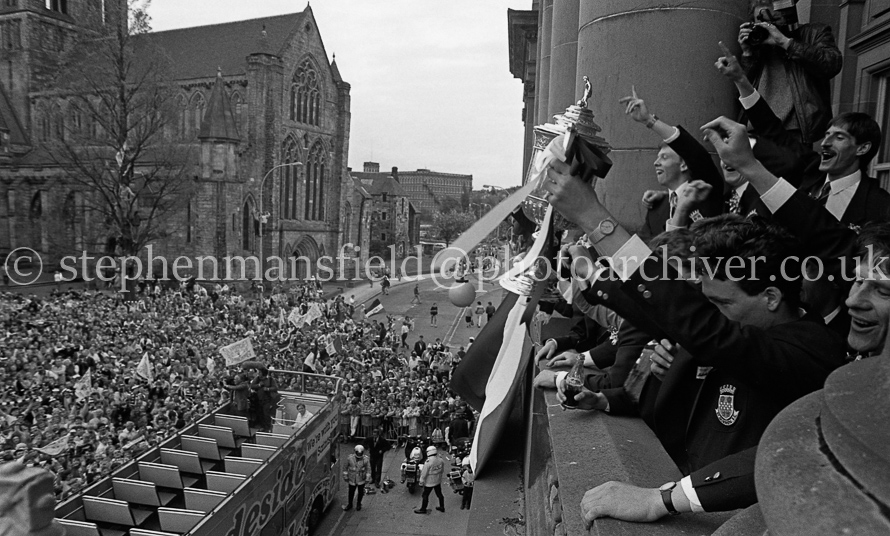 The St. Mirren Football team arrive back in Paisley after winning the Scottish Cup in the 1-0 final with Dundee United at Hampden Park. Ian Ferguson was the scorer and was the third cup win in their then 110-year history. Pictures by Stephen Mansfield.