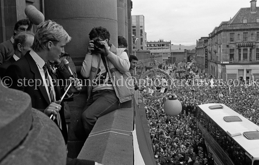 The St. Mirren Football team arrive back in Paisley after winning the Scottish Cup in the 1-0 final with Dundee United at Hampden Park. Ian Ferguson was the scorer and was the third cup win in their then 110-year history. Pictures by Stephen Mansfield.