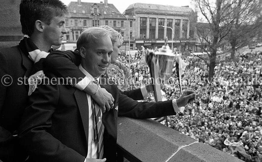 The St. Mirren Football team arrive back in Paisley after winning the Scottish Cup in the 1-0 final with Dundee United at Hampden Park. Ian Ferguson was the scorer and was the third cup win in their then 110-year history. Pictures by Stephen Mansfield.