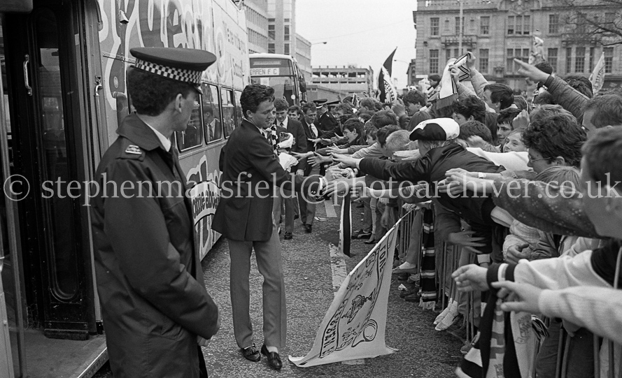 The St. Mirren Football team arrive back in Paisley after winning the Scottish Cup in the 1-0 final with Dundee United at Hampden Park. Ian Ferguson was the scorer and was the third cup win in their then 110-year history. Pictures by Stephen Mansfield.