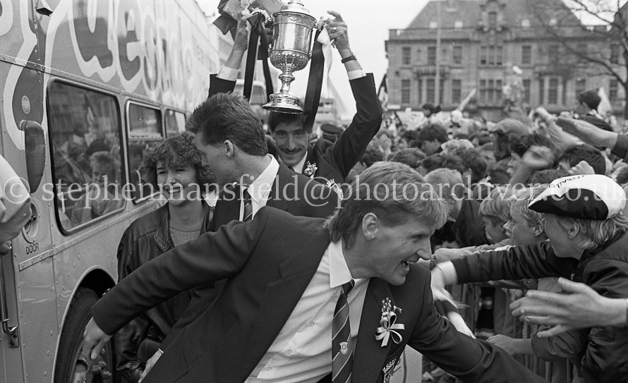 The St. Mirren Football team arrive back in Paisley after winning the Scottish Cup in the 1-0 final with Dundee United at Hampden Park. Ian Ferguson was the scorer and was the third cup win in their then 110-year history. Pictures by Stephen Mansfield.