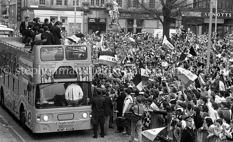 The St. Mirren Football team arrive back in Paisley after winning the Scottish Cup in the 1-0 final with Dundee United at Hampden Park. Ian Ferguson was the scorer and was the third cup win in their then 110-year history. Pictures by Stephen Mansfield.