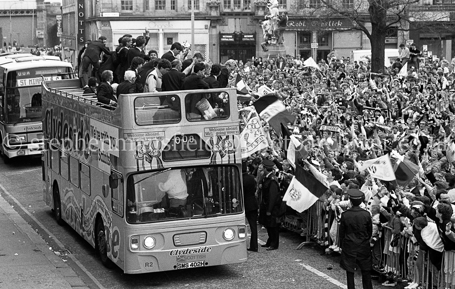 The St. Mirren Football team arrive back in Paisley after winning the Scottish Cup in the 1-0 final with Dundee United at Hampden Park. Ian Ferguson was the scorer and was the third cup win in their then 110-year history. Pictures by Stephen Mansfield.