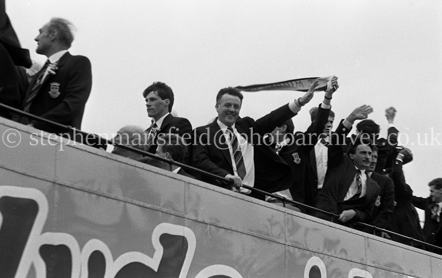 The St. Mirren Football team arrive back in Paisley after winning the Scottish Cup in the 1-0 final with Dundee United at Hampden Park. Ian Ferguson was the scorer and was the third cup win in their then 110-year history. Pictures by Stephen Mansfield.