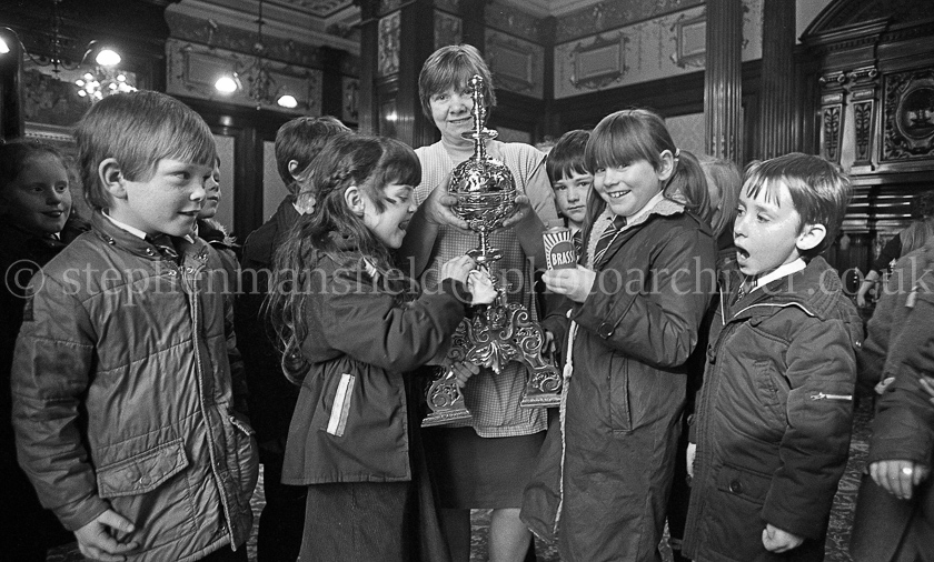 St. Mirin's Primary School in the South Side of Glasgow visited the headquarters of Glasgow City Council, the Glasgow City Chambers in George Square in February 1984. Pictures by Stephen Mansfield for the South Side News.