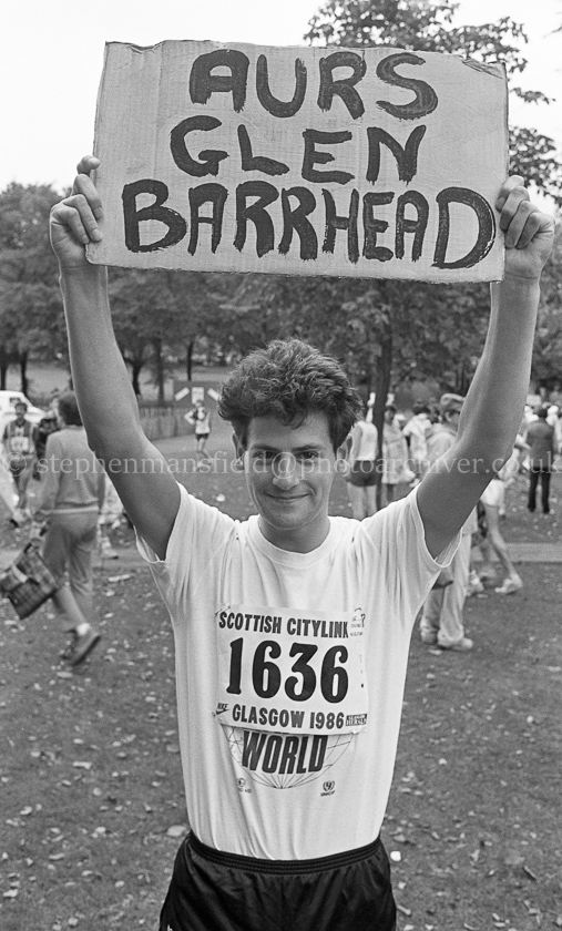 A collection of pictures taken at the finish of the Scottish Citylink Glasgow Marathon on Glasgow Green. They were taken on Sunday 21st September 1986 for the Barrhead and South Side News by freelance photographer Stephen Mansfield.