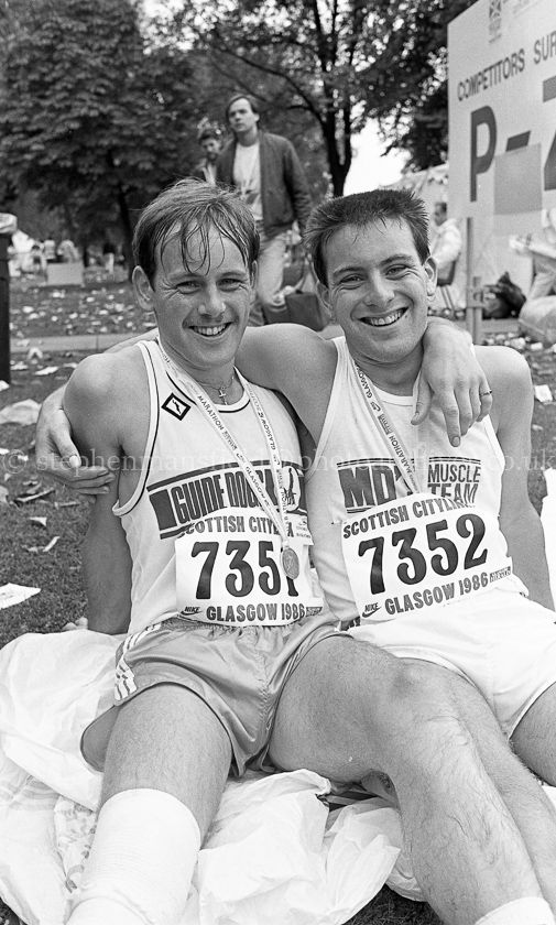 A collection of pictures taken at the finish of the Scottish Citylink Glasgow Marathon on Glasgow Green. They were taken on Sunday 21st September 1986 for the Barrhead and South Side News by freelance photographer Stephen Mansfield.